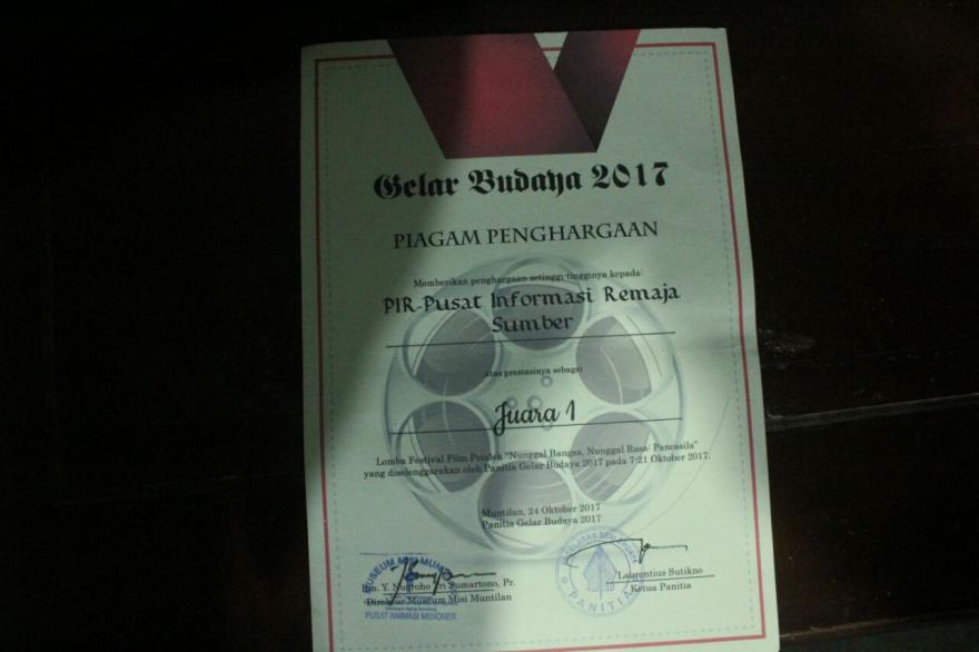 SUMBER SID- Remaja Desa Sumber yang tergabung dalam Pusat Informasi Remaja berhasil raih juara pertama dalam lomba festival film pendek "Nunggal Bangsa, Nunggal Rasa: Pancasila" yang diselenggarakan panitia gelar budaya 2017 musium misi Muntilan.